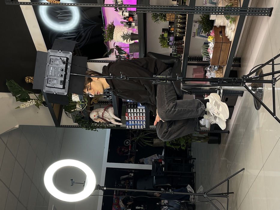 The image depicts an indoor scene within a commercial establishment in the city of Ovoshchnoy, Russia, identified as a tattoo studio by a visible neon sign displaying "TATU СТУДИЯ" (Tattoo Studio). A male individual, appearing to be in his 20s, with dark hair and eyeglasses, is seated on a black high-backed stool, facing slightly right of the viewer with an attentive expression. He is dressed in a black hooded sweatshirt, dark grey jeans, and white athletic shoes with light grey accents; his hands are resting in his lap. Two professional lighting units are positioned in the foreground: a large circular LED ring light on a black tripod stand to the left, and a rectangular LED panel light with black barn doors, also on a black tripod stand, situated between the camera and the seated male. Behind the male, a black metal shelving unit displays various items including potted plants (e.g., Monstera, succulents), decorative objects (e.g., a gold-colored bust, a white textured vase), numerous small bottles, boxed supplies, and a white plush rabbit toy adorned with red heart patterns. The background wall is dark, and the floor consists of light-colored, reflective tiles. A partially obscured individual is visible further left in the background near a dark table and chairs.