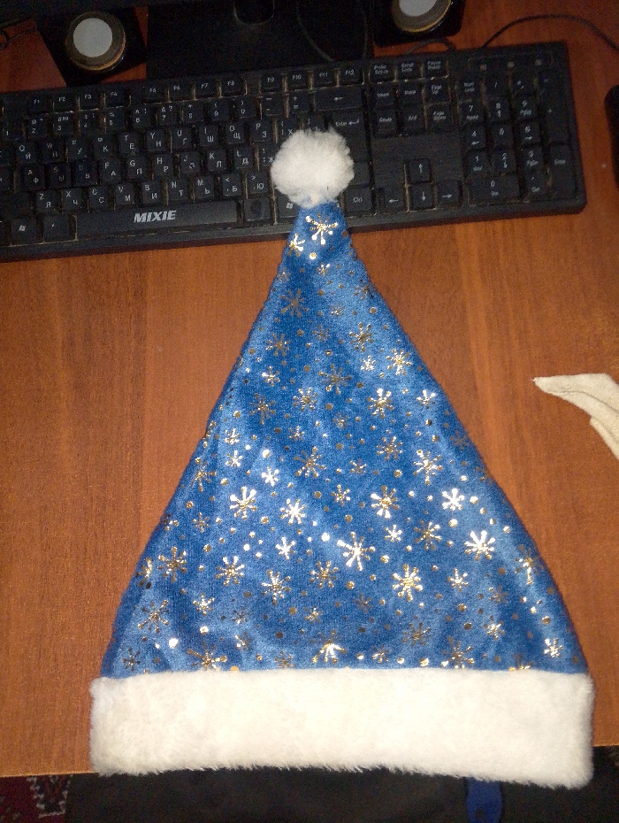 A blue Santa hat with gold snowflakes and a white pom-pom sits on a wooden desk next to a black keyboard