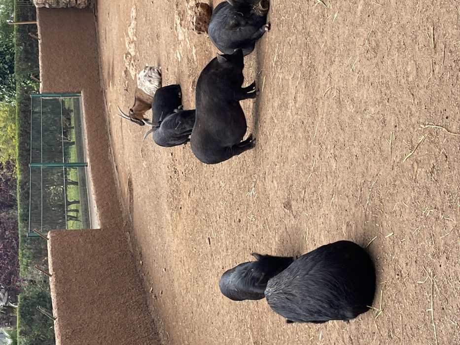 The scene depicts an open-air animal enclosure, likely within Safari Zoo Mallorca in Sant Llorenç des Cardassar, Spain. The foreground and midground consist of dry, reddish-brown dirt with sparse scattered straw and small rocks. Six black pigs of varying sizes are distributed across the enclosure. In the immediate foreground-left, one black pig is seen from the rear, seated or lying down, facing away from the viewer. Another smaller black pig is partially obscured near it, with its head down. Centrally, a large black pig stands, facing right, appearing to nose or interact with another black pig lying on its side to the right. Further back, a smaller black pig stands, facing right, near the back wall. Another black pig is partially visible behind it. In the upper-right background, a brown and white goat with prominent curved horns lies resting on the dirt. The enclosure's perimeter features a textured, reddish-brown, mud-like wall on the left and stretching towards the background. This wall is topped with several vertical wooden stakes. Behind this wall, a green metal fence is visible, beyond which lies an area with lush green foliage and trees, indicating a wider natural or park environment. The overall scene is static, with the animals resting or moving slowly within their habitat.