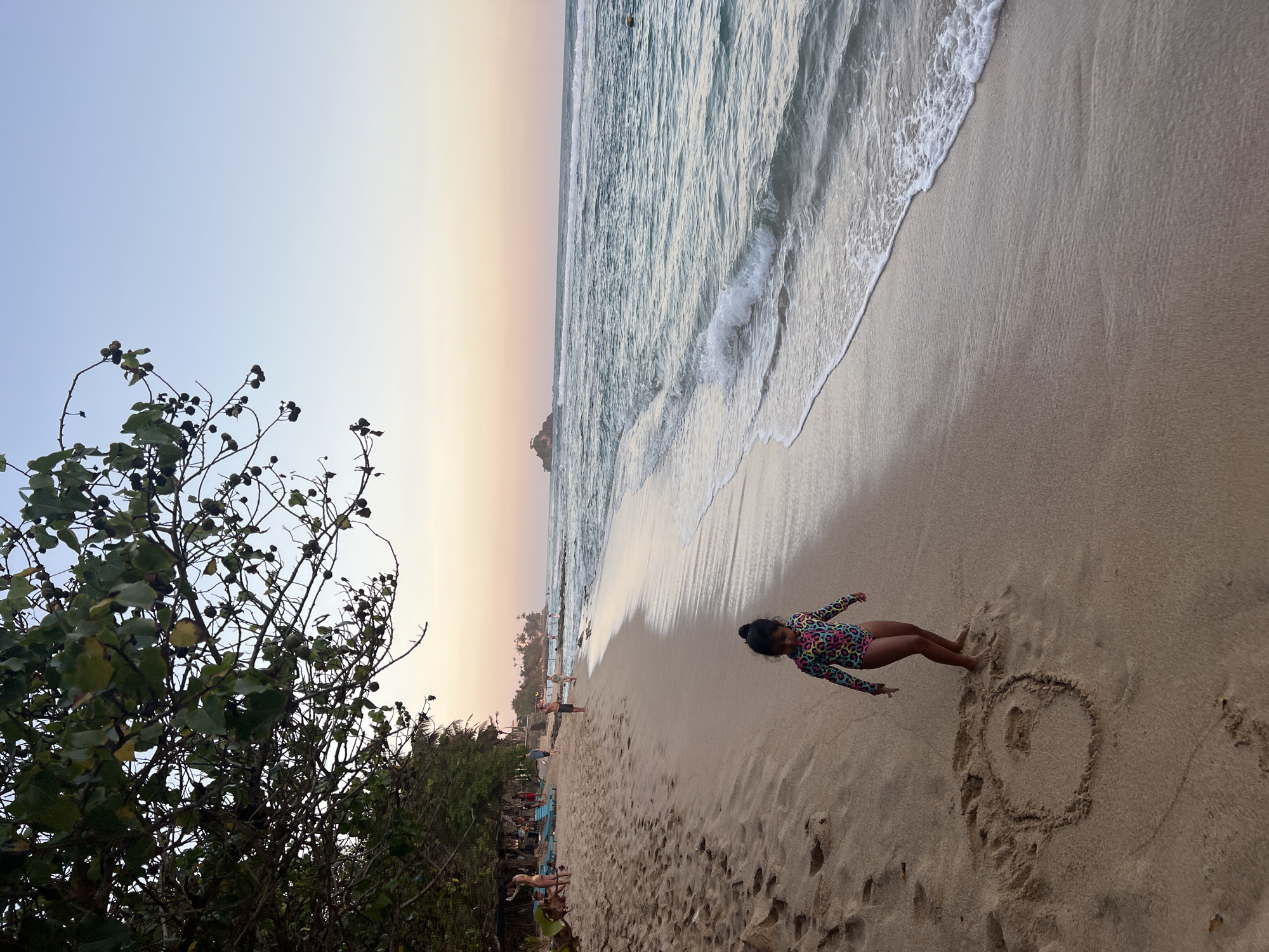 This image depicts a beach scene in Goviyapana, Sri Lanka, during late afternoon or early evening. In the immediate foreground, a young child with dark hair pulled back, wearing a long-sleeved, multi-colored animal print swimsuit, stands barefoot on the damp sand. The child is looking down and slightly to the left. To the child's left, a large circular drawing with an inner dot or smaller circle is etched into the sand, along with several footprints. The sandy beach extends into the midground, where gentle waves break along the shoreline, creating white foam. Several individuals are visible further down the beach: some are positioned near blue lounge chairs under dense green foliage to the left, while others walk closer to the water's edge. In the background, the Indian Ocean stretches to the horizon, characterized by multiple parallel waves. A small, rocky island or outcrop, topped with sparse vegetation, is visible in the distant water. The sky transitions from a soft pale orange-pink near the horizon to a light blue overhead, indicative of twilight. Overhanging branches with dark leaves and small, dark fruits frame the upper left portion of the image.