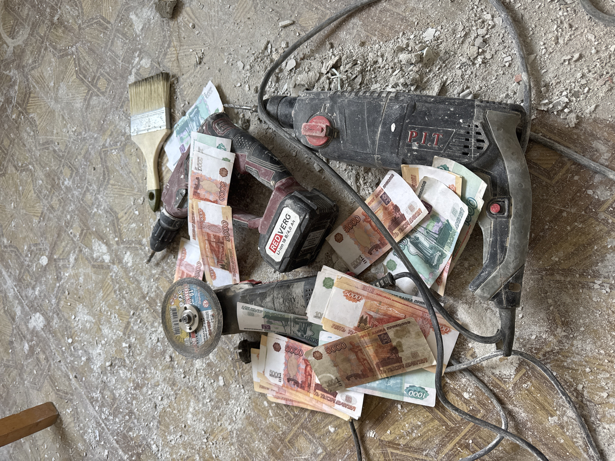 The image depicts a cluttered construction scene, likely indoors, with a collection of tools and Russian currency scattered across a surface covered in debris
