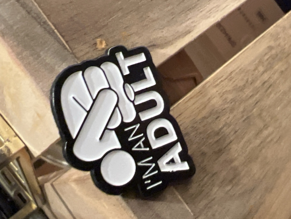 A black and white rubber charm, approximately 6 cm in length, is depicted resting diagonally on a light brown wooden surface. The charm features a white, stylized stick figure in a fetal or crouched position with a raised fist, positioned above the white capitalized text "I'M AN ADULT" on a black background with a thin black border. The wooden surface exhibits visible grain patterns and appears to be constructed from multiple planks. In the upper left background, out-of-focus metallic elements with a gold finish are partially visible. The lower right background reveals a rectangular recess in the wood, exposing a lighter internal surface with faint, dark text partially legible as "SPEAKER". This indoor scene is situated within the city of Tromsø, Norway. No people are present, and no active interactions are observed.