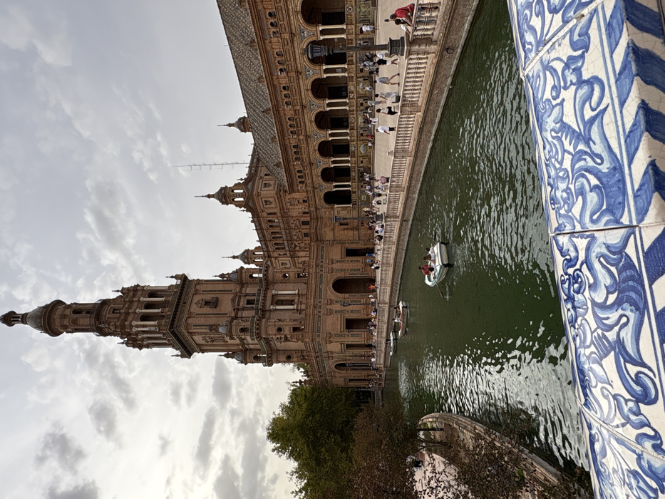 The image depicts a panoramic view of the Plaza de España in Seville, Spain, under an overcast sky