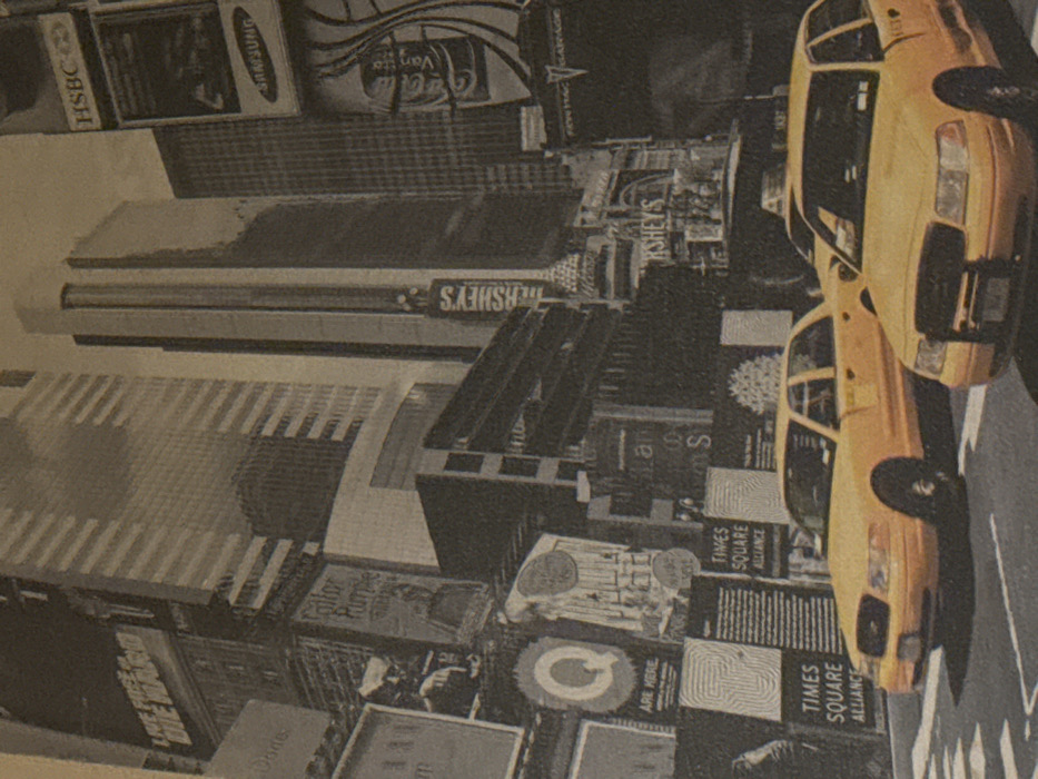 This image is a photograph of a printed visual display, physically located in Strasbourg, France. The depicted scene is a desaturated, densely urban street environment identified as Times Square, New York City, United States. In the foreground and midground, two yellow Ford Crown Victoria taxicabs are visible. The leading cab is positioned on a white-striped pedestrian crosswalk, facing slightly towards the viewer's right. The second cab is slightly behind and to its left. The background features multiple towering skyscrapers and commercial buildings extensively covered with large advertising billboards and electronic displays. Key identifiable signage includes prominent vertical "HERSHEY'S" brand signs on buildings, multiple "TIMES SQUARE ALLIANCE" indicators, an "HSBC" logo, a "SAMSUNG" logo, a billboard advertising "The Color Purple," and another for "Live Free or Die Hard." A "Vanilla Coke" bottle image is also discernible on a large display. No individual people are clearly visible within the frame, and no active interactions are explicitly depicted; the scene focuses on the architectural and commercial elements of the metropolitan setting.