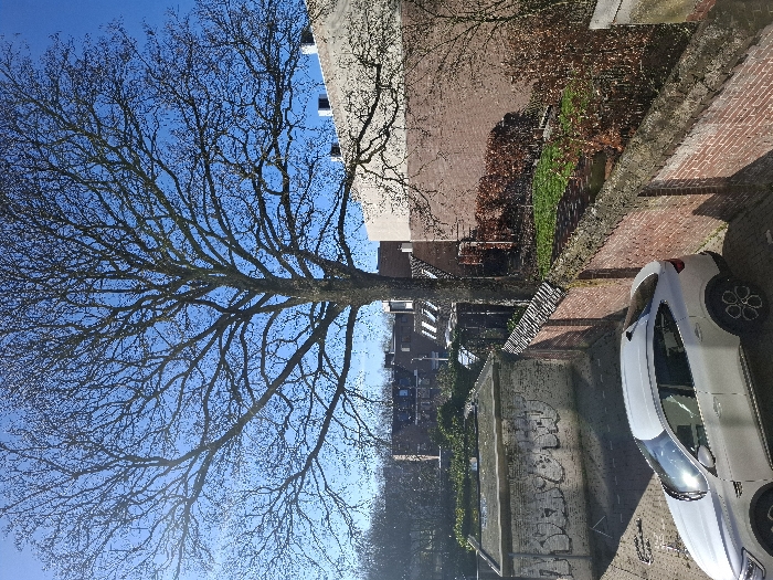 The scene depicts an outdoor urban environment in Tilburg, Netherlands, under a clear, bright blue sky. A large, leafless deciduous tree, displaying a dense network of bare branches, dominates the central and upper portions of the frame. In the lower left, a silver Renault Arkana SUV-coupe is parked on a light-colored paved surface, oriented towards the left with its front section partially cropped. Adjacent to the parked vehicle, in the mid-left, stands a single-story, flat-roofed structure with light-colored walls extensively covered in black spray paint graffiti. A weathered brick wall, topped with dark coping stones, extends diagonally from the lower right towards the center, delineating a paved area from a slightly elevated section of ground. This higher ground features a patch of green grass bordered by brown, leafless shrubbery or hedges. In the background, multiple buildings of varying heights are visible, constructed from brick and lighter-toned materials, some with visible roof features such as dormers or mechanical units. No individuals, actions, or direct interactions are depicted in the image.
