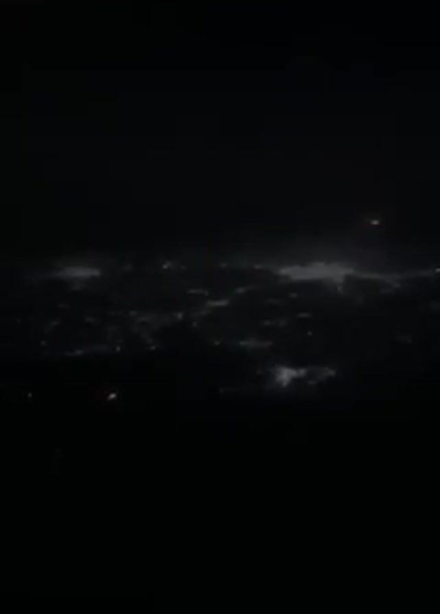 night view of a city from above. It is very dark, but the lights of the city are visible, with some lights appearing brighter and others appearing more diffused, possibly due to clouds or atmospheric conditions. The overall impression is of an urban landscape seen from a high altitude at night.