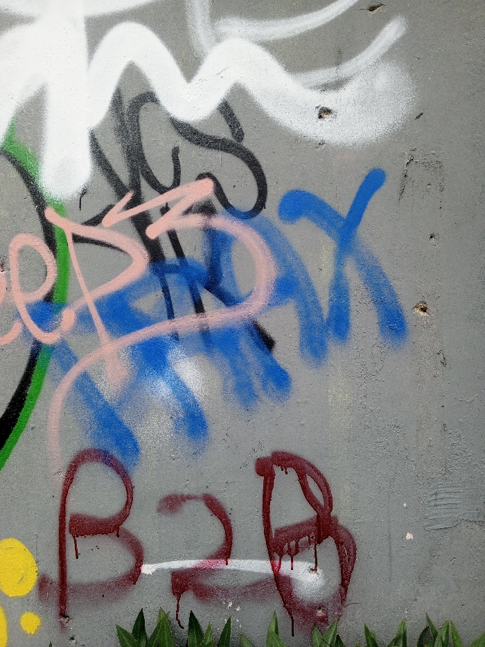 A weathered, light gray concrete wall, likely situated at ground level in Voa Yeav, Cambodia, is extensively covered with layered graffiti. The topmost layers include broad, wavy white spray paint strokes dominating the upper portion, partially overlapping black calligraphic shapes. Beneath these, thin pink spray-painted script runs horizontally across the mid-left. Distinct blue spray paint forms abstract shapes and a clear 'x' in the mid-right. At the bottom-left, yellow circular spray paint marks are visible. The lowest discernible layer of graffiti consists of dark red spray paint, forming two distinct, dripping characters resembling 'B' and '2', with significant paint runs extending downwards. A vertical green spray paint line is present on the far left. The bottom edge of the wall meets a row of vibrant green, pointed leaves, suggesting a natural or artificial plant border. The wall surface shows minor pockmarks and texture variations beneath the paint. No people, actions, or direct interactions are depicted.