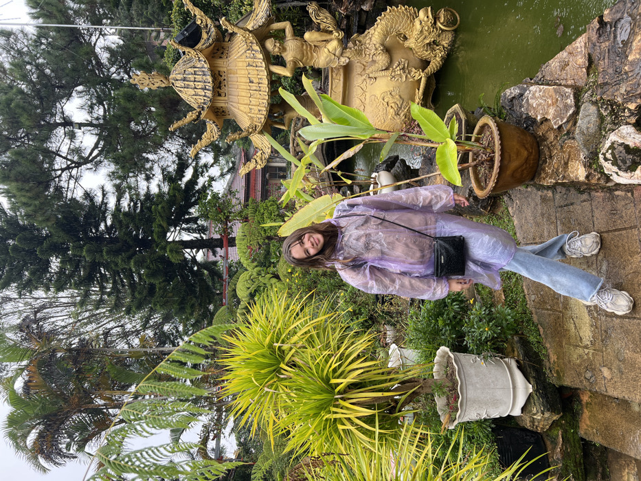 A woman stands in a lush garden wearing a light purple raincoat, blue jeans, and gray sneakers. She carries a small black purse. Behind her is a pond adorned with a golden dragon and turtle statue. The garden is filled with various plants, including ferns, potted greenery, and towering trees. The ground is paved with stone, and the sky appears overcast.