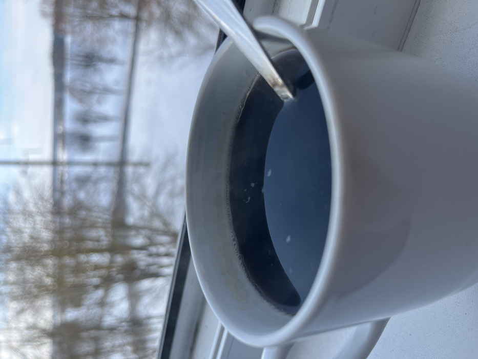 A white ceramic mug containing a dark liquid, possibly coffee, is positioned on a white window sill in Lida, Belarus
