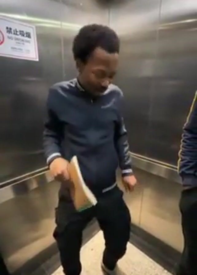 Inside a small elevator, a man with dark hair and a beard, wearing a navy blue zippered jacket, black pants, and gray shoes, holds a tan notebook with a green sticky note on the cover. He is dancing slightly and pointing at the camera with his right hand. Another man, partially visible on the right, wears a blue and yellow striped shirt. A “No Smoking” sign is visible in the upper left corner of the elevator. The elevator's interior is stainless steel with a patterned floor. The man is speaking in an animated fashion, looking directly at the camera.