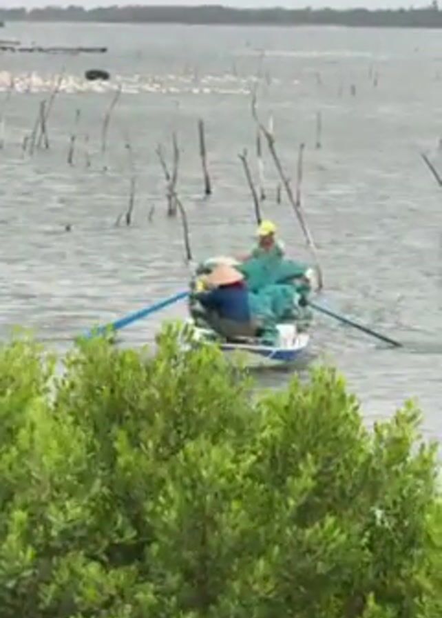 Two people in a small white boat are seen rowing on a body of water filled with bare sticks and tree trunks sticking out of the water. The boat is loaded with green sacks. The person in the front is wearing a conical Asian hat. The other person is wearing a light green shirt and a hat. Green foliage is visible in the foreground. The sky is overcast.