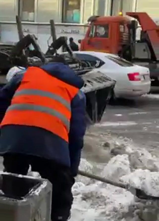 A man in an orange safety vest shovels snow into the bucket of a piece of construction equipment. In the background, a red dump truck sits parked on the street. Cars pass by in the background. The man continues shoveling snow into the bucket. Once the bucket is full, the construction equipment backs away from the curb and turns to face the street. It slowly drives off.