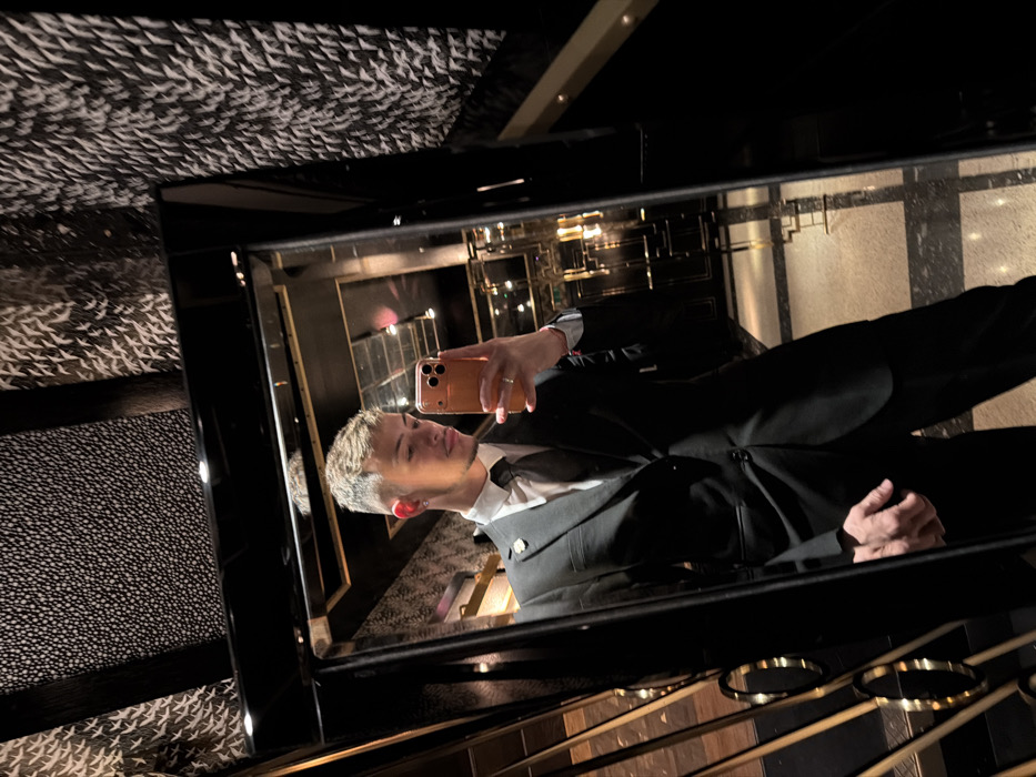 A young male is depicted in a mirror selfie taken within the interior of The Beaumont Hotel, Mayfair, London, United Kingdom