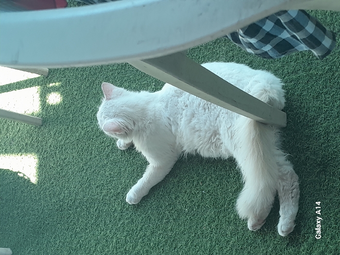 - "The image depicts a white, long-haired domestic cat resting on artificial green turf" by FM-V8KrL2, licensed under CC BY 4.0