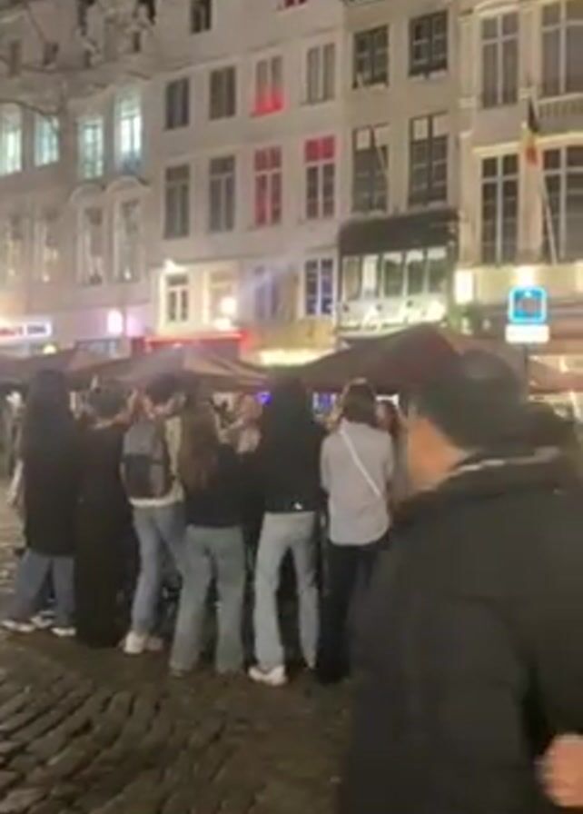 European city square at night, likely Brussels given the flag. A group of people are gathered around watching an accordion player. Some are filming on phones. The square is paved with cobblestones and there are buildings with distinctive architecture surrounding the open space. Some buildings have awnings and people are dining outdoors. The street is wet, possibly from rain. The overall atmosphere is lively and festive.