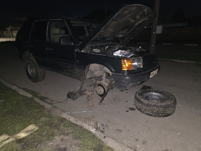 At an unspecified location in the city of Koinare, Bulgaria, a dark-colored, four-door SUV, consistent with a Range Rover Classic model, is positioned on an asphalt road adjacent to a grassy curb area at night. The vehicle's hood is open, exposing the engine bay, and a paper item, possibly a manual or magazine, rests on the front radiator support panel. The front left wheel is entirely removed, leaving the brake rotor assembly and suspension components exposed. The front of the vehicle is elevated, suggesting it is on a jack (not fully visible). On the asphalt directly in front of the vehicle's missing wheel well lies a removed wheel with a tire. A single coil spring is on the ground near the wheel hub, while a second, longer coil spring or strut assembly is further back, closer to the curb. Small metallic fasteners are scattered on the ground near the curb. A yellow/beige strap or tow rope is visible on the grass to the left of the scene. The road surface below the vehicle shows some dark fluid stains. A utility pole stands upright behind the front right side of the vehicle. No individuals are present in the image.