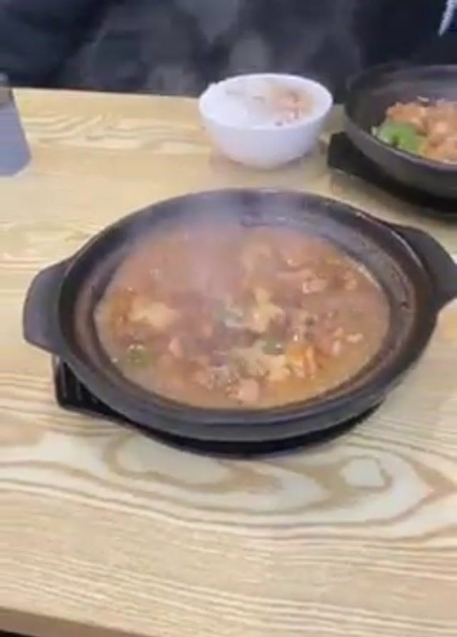 steaming clay pot on a wooden table. The pot contains a stew with pieces of meat and green onions in a brown sauce. A white bowl of rice sits nearby. Other people and another plate of food are partially visible in the background. The steam obscures some of the view of the stew.
