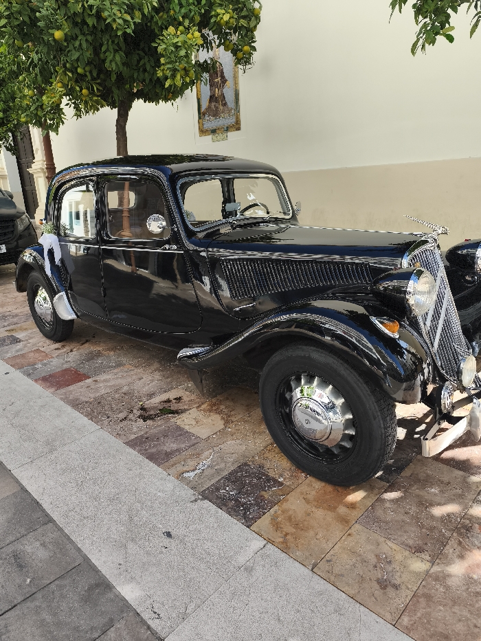 A black vintage Citroën Traction Avant sedan is parked on a multi-hued stone paver pavement in an outdoor urban setting in Unknown, Unknown. The four-door vehicle, featuring chrome trim, a prominent vertical grille, and a hood ornament, has white decorative ribbons tied to its passenger-side rearview mirror. A light-colored building wall forms the background, upon which a framed religious icon depicting a robed figure is mounted. A citrus tree, bearing green leaves and unripe green fruits, grows in front of the wall, partially overhanging the vehicle. A dark modern vehicle is partially visible behind the vintage car's rear on the far left. A grey concrete curb runs along the left edge of the pavement. The scene is illuminated by natural daylight, casting shadows. No people are visible.