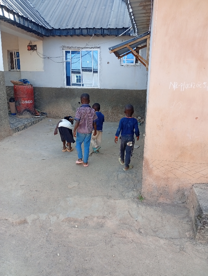 Four children are walking away from the camera on a concrete surface. A building with gray walls and a corrugated metal roof is visible in the background. There's a red barrel next to the building. A pink wall is on the right side of the image with some writing on it. The light appears to be diffused, creating soft shadows.