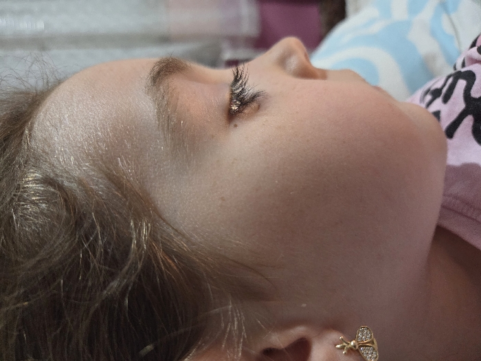The image depicts a close-up profile view of a young individual, situated in the city of Troyan, Bulgaria. The subject is facing towards the right side of the frame, with the left side of the face prominently featured. Visible details include fair skin, light brown hair styled away from the forehead, a natural light brown eyebrow, and a partially closed left eye adorned with long, dark eyelashes and a subtle iridescent eyelid shimmer. A small, golden-colored earring shaped like a bee, encrusted with reflective stones, is present in the subject's left earlobe. The subject is wearing a pink upper garment with a visible dark graphic design. The background is blurred, showing a light blue fabric with a white pattern, consistent with bedding, in the lower right, and a lighter, indistinct area above, indicating an indoor environment. No specific action or interaction is discernible beyond the subject's posture.