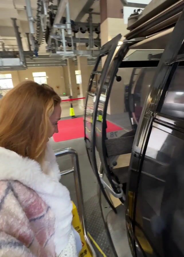 A woman wearing a white and pink patterned coat enters a cable car. The interior of the cable car has a small screen playing a video, as well as windows. The woman smiles and looks at the camera. Outside the cable car, other cable cars can be seen moving along the tracks. The cable car loading area has a red mat and yellow safety cones.