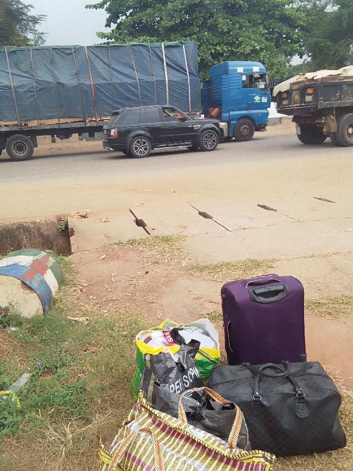 A roadside scene shows a blue truck and a flatbed truck passing a black Range Rover. In the foreground, luggage is set down: a purple rolling suitcase, a black duffel bag, a striped woven bag, and a white and yellow sack. A cylindrical object is painted with colored stripes and sits by the grass. The road surface is cracked and deteriorating.