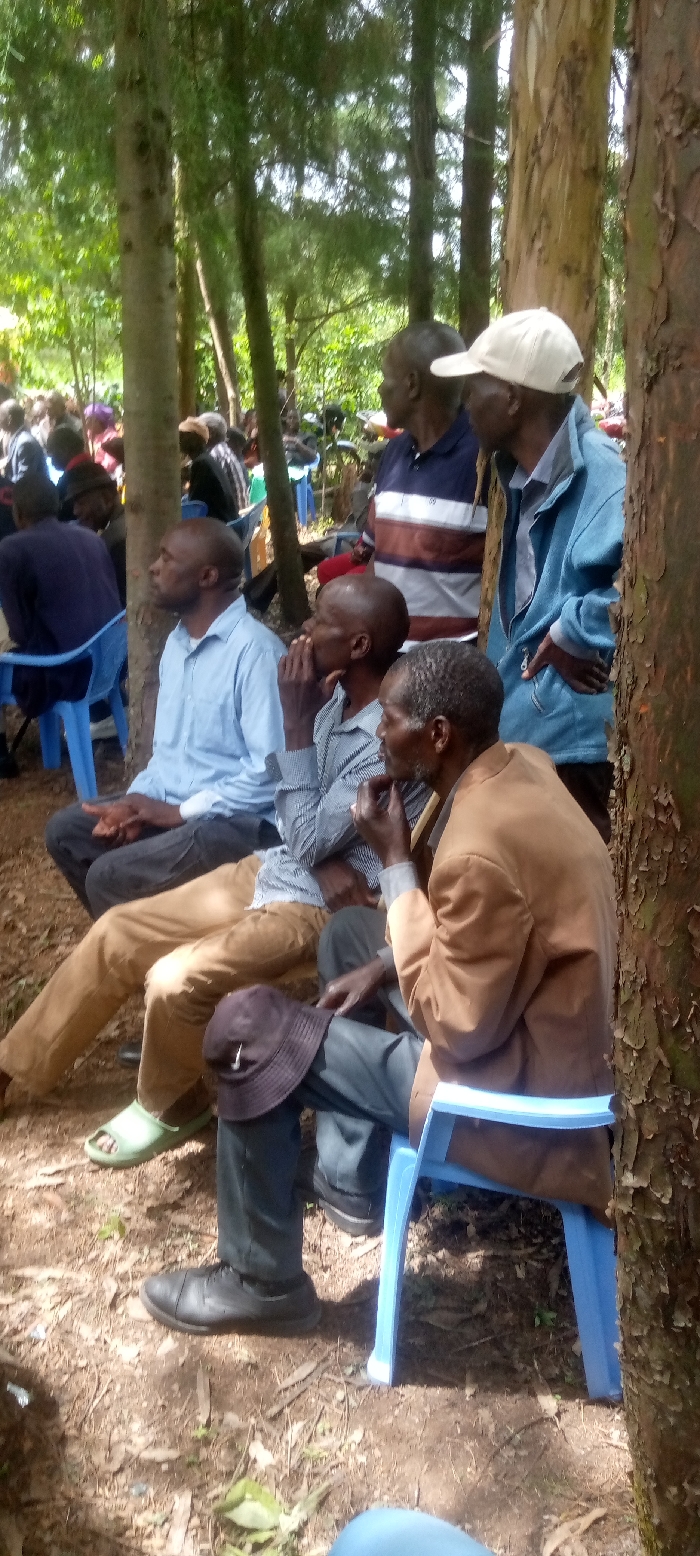 The scene is outdoors, in a clearing in a wooded area, likely a park or forest. The location, based on the provided coordinates, is an area of dense vegetation near the outskirts of Burundu, Kenya. The ground is covered in dry leaves and dirt. Five men are seated on blue plastic chairs in a semi-circle. The man in the front row is wearing a tan jacket, a white shirt, a pair of blue jeans, and black shoes. He has a beard and is touching his chin with his right hand. He is seated on the right side of the blue chair. The man next to him is wearing a white shirt, tan slacks, and black shoes. He is looking at the camera with a neutral expression. He is seated to the left of the tan jacket man, and the chair is partially obscured. The third man is wearing a black and white striped shirt, tan slacks, and black shoes. He is looking off to the left of the camera. He is seated to the left of the white shirt man, and the chair is partially obscured. The fourth man is wearing a light blue jacket over a blue shirt, dark pants, and black shoes. He is looking off to the right of the camera and his hands are tucked in his pockets. The fifth man is wearing a light blue shirt and dark pants. He is seated on the left side of the picture, and the chair is partially obscured. There are other people in the background, likely participating in a gathering or meeting. The trees are tall and slender, with dense canopies. The scene appears to be well-lit. The men are sitting in an informal grouping and their postures are relaxed, suggesting they are taking a break or in a social setting.