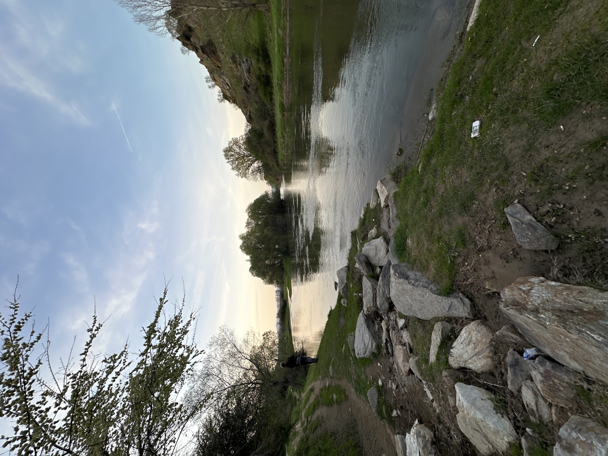 A landscape-oriented photograph depicts a river scene. The photo is taken at ground level, with the right side of the frame closer to the viewpoint and the left side receding into the distance. A body of water, presumably a river, runs through the center of the image, reflecting the sky above. The water surface is slightly rippled. The sky is visible at the top of the frame and features a mix of light blue and white clouds. A contrail from an aircraft is also visible. The riverbanks are covered in green vegetation, with patches of dirt and rocky areas. Large, gray rocks are scattered along the right riverbank. On the right side of the river, a partially obscured individual stands near a small tree, appearing to be at the edge of the bank, perhaps fishing. Debris in the form of a crumpled white and blue package is visible on the bank on the right. Based on the prompt, this scene is likely located in Krumovo, Bulgaria.