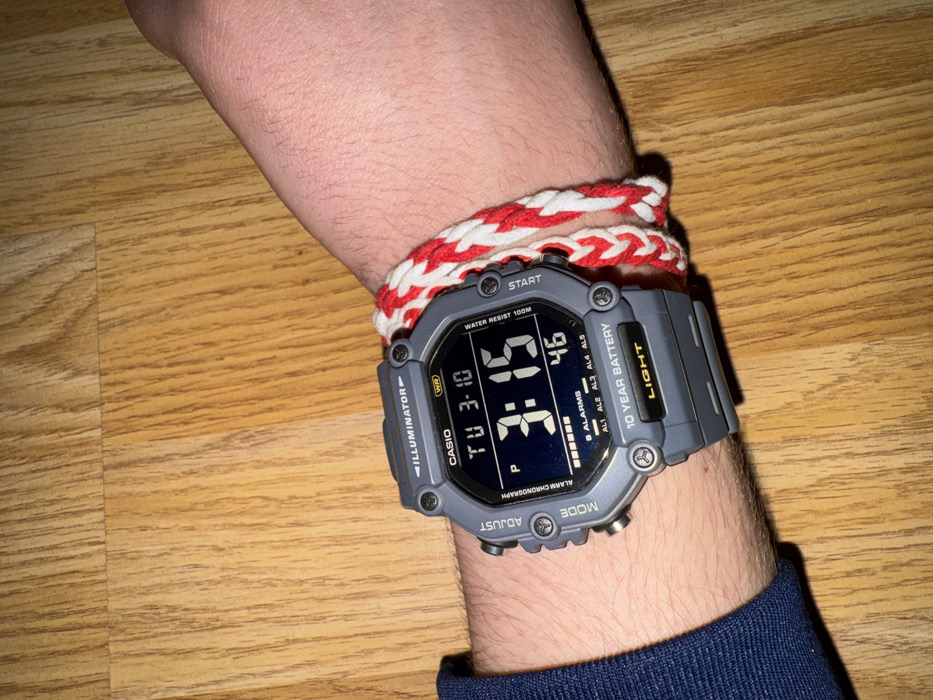 The scene, set in Cherven Bryag, Bulgaria, depicts a close-up view of a human left forearm and wrist, positioned on a light brown wooden surface with visible grain patterns. The precise location within the city cannot be determined from the visual evidence. A dark blue fabric sleeve covers the upper left portion of the arm. A gray digital Casio wristwatch with a black display is worn on the wrist. The watch display shows "TU 3-10" (Tuesday, March 10) and the time "3:15", with the number "46" below the time. Visible text on the watch includes "ILLUMINATOR", "WR" (Water Resist), "10 YEAR BATTERY", "LIGHT", "ADJUST", "MODE", "ALARM CHRONOGRAPH", and "START". Adjacent to the watch, on the wrist, are two braided fabric bracelets. One bracelet is predominantly red and white, while the other is primarily red with interwoven white strands. The wooden surface is evenly illuminated, suggesting an indoor setting with direct lighting.