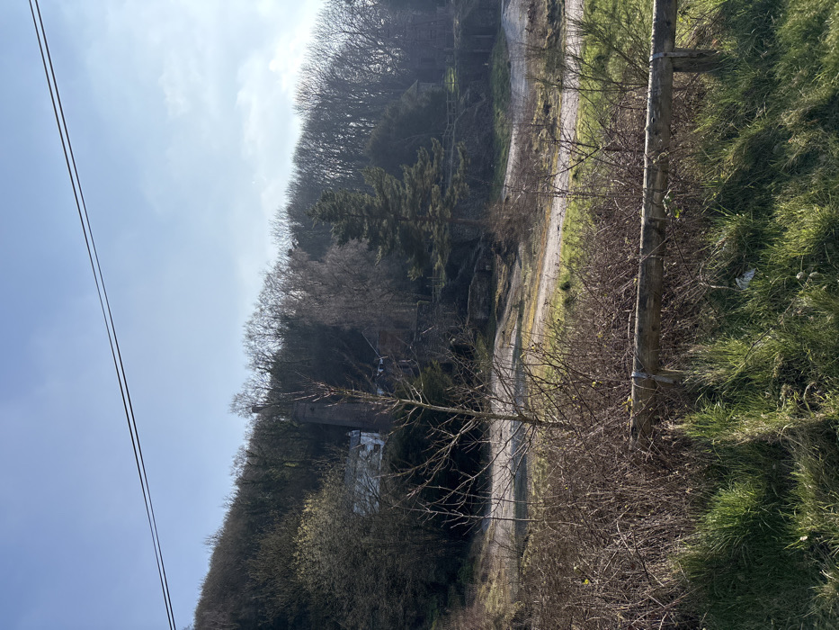 This image depicts a landscape scene at the Snailbeach Lead Mine site in Snailbeach, United Kingdom, on a clear day. The top quarter of the frame shows a light blue sky with minimal cloud cover, traversed horizontally by two thin, dark parallel lines, likely power lines or cables. The mid-ground is dominated by a tree-covered hillside sloping downwards from left to right. The trees are primarily deciduous, appearing largely bare, indicating a late winter or early spring season. Nestled within this wooded slope are several stone and brick structures consistent with historical industrial architecture. A tall, slender brick chimney rises prominently on the left side, partially obscured by surrounding trees. Other stone buildings, some with white-painted upper sections or roofs, are visible deeper within the trees. A distinct, dark green conifer tree stands in the center-right mid-ground. Below these structures, dirt or gravel paths wind through patches of green grass and sparse vegetation. A low, weathered stone wall or embankment, topped with a rustic wooden railing, runs horizontally across the mid-ground. The foreground consists of dense natural vegetation. On the left, vibrant green grass is prominent. Towards the center and right, the vegetation transitions to a thick tangle of dry, brown, thorny shrubs and small, bare deciduous saplings. A weathered wooden log fence, comprising a horizontal rail secured by light-colored metal bands to upright posts, extends across the lower right portion of the foreground. A piece of white debris, possibly paper or plastic, is visible in the grass near the fence on the right. No people or animals are present in the scene. There are no ongoing actions or interactions depicted.