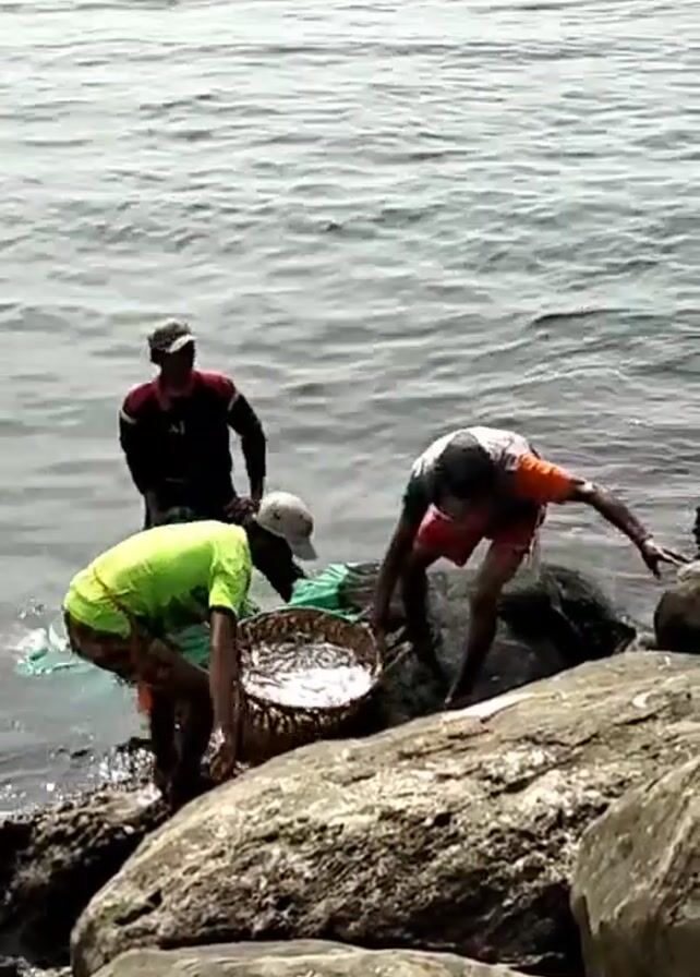 Three men are near the ocean's edge. Two are bent over, working, while the third stands, looking on. The man standing is wearing a dark jacket with red sleeves and a baseball cap. One of the working men is in a lime green shirt and baseball cap, kneeling beside a large woven basket filled with what appear to be small fish. The other working man, wearing a grey shirt with orange trim and dark shorts, is bent over near the rocks, reaching towards the water. There are large rocks along the shore where they are standing, and the ocean is visible in the background. The day appears overcast.