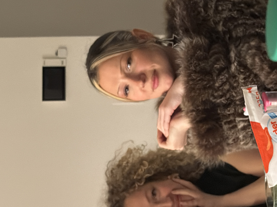 This image captures an indoor scene in the city of Saint-Denis, France, featuring two women in a casual setting. The immediate background consists of a plain, light-colored wall. The central figure is a woman positioned slightly right of center, facing forward. She has blonde hair with darker roots, styled with bangs pulled to the sides. She exhibits visible eye makeup and a neutral expression with a slight upturn at the corners of her mouth. A large, dark, five-pointed star-shaped earring is visible on her left ear. She is wearing a thick, dark brown, shaggy faux fur garment, with her hands clasped together and resting on the garment in front of her. To her left, a second woman is partially visible, primarily her head and upper torso. She has tightly curled light brown or blonde hair. Her left hand is raised to her chin and mouth, partially obscuring her face, which displays a smiling expression. She is wearing a dark top. Both individuals are looking directly towards the camera. In the immediate foreground, on a surface below the subjects, a white package with red and white branding, partially identifying as "Kinder," is visible. Adjacent to it, a small pink object and a partially visible green object are present. Mounted on the background wall, above the central figure's head, is a rectangular black digital display or control panel. To its right, a smaller, lighter-colored component with a curved detail is attached to the wall. The scene is illuminated by artificial lighting.