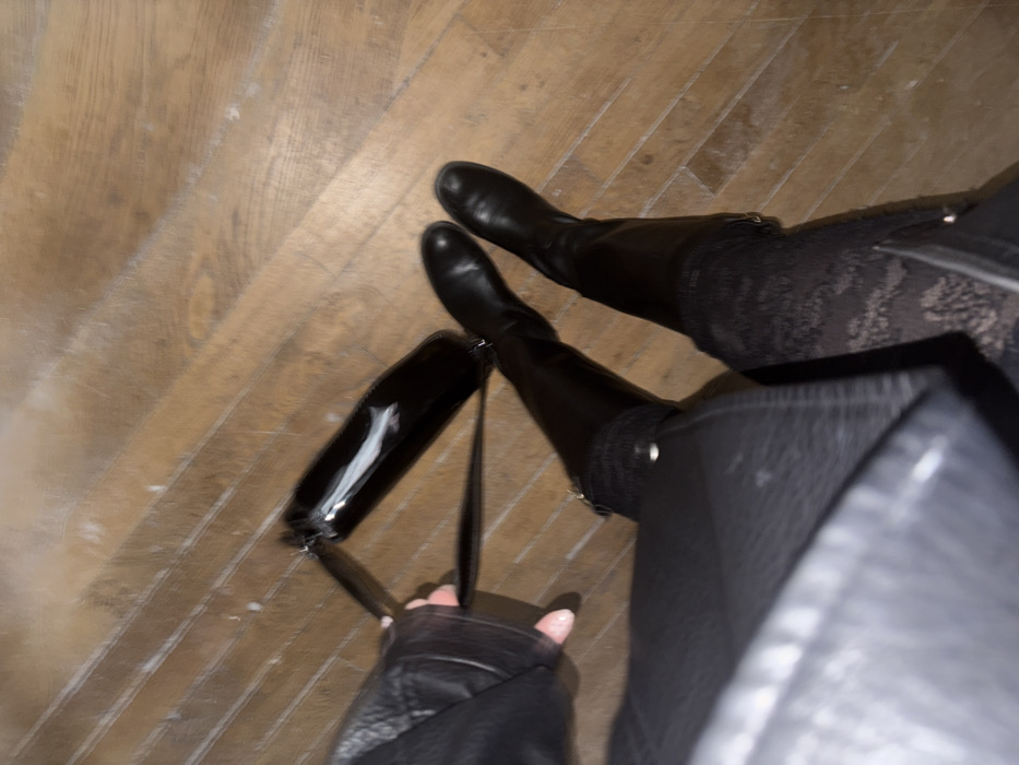 The image, captured in Asnières-sur-Seine, France, presents a high-angle, downward view of an individual's lower body and personal effects, characterized by significant motion blur. The subject wears black knee-high or thigh-high boots over what appear to be black patterned or lace leggings. A black skirt or shorts, possibly leather, is partially visible at the upper thighs, featuring silver-toned circular hardware near the hem. The individual's left hand, with light-colored fingernail polish, holds a glossy black shoulder bag with a visible strap. The bag reflects a distinct white light source. The immediate environment consists of a light brown wooden parquet floor, arranged in a diagonal pattern, showing some surface variations or dust.