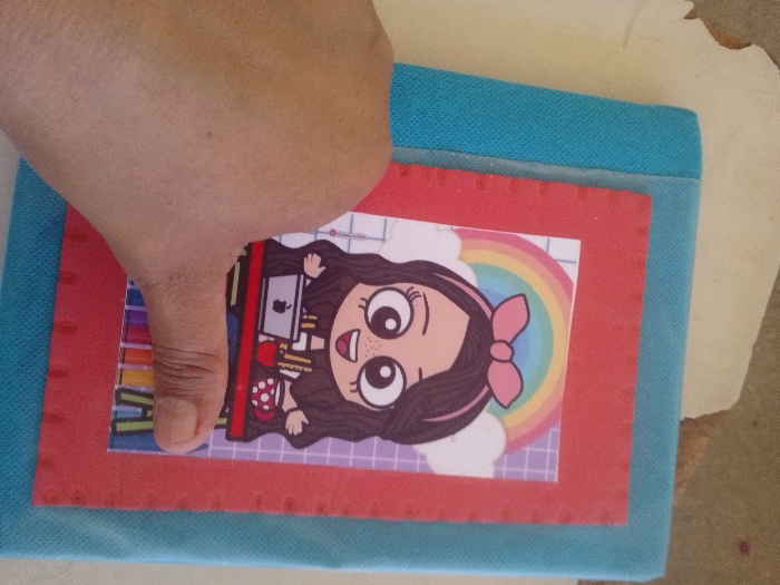 A close-up, top-down perspective captures a light-skinned human hand pressing down on a stack of layered objects on an indistinct light-colored surface in La Tagua, Venezuela. The hand, with its thumb visible in the lower-left portion of the frame, rests upon a vertically oriented paper card. This card features a cartoon female character with dark hair, a pink bow, large eyes, and an open-mouthed smile, depicted seated at a desk with a laptop displaying an Apple logo, a mug, and books. The character is set against a background featuring a rainbow, clouds, and a purple grid pattern. This cartoon card is positioned on top of a red, rectangular object with a visibly textured surface, showing a pattern of small, raised circular indentations along its upper and left edges. Beneath the red object is a blue, rectangular object with a fibrous texture, possibly fabric. An irregular, light-colored surface is visible in the upper right and along the right edge of the frame.