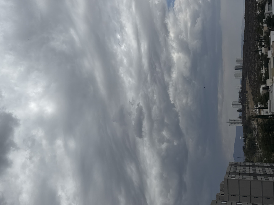 The image displays an elevated view of an urban and semi-urban landscape in northern León, Mexico, under a heavily overcast sky. The upper two-thirds of the frame are dominated by dense, multi-layered grey clouds, exhibiting varying shades from bright grey to dark slate, suggesting an impending weather event or recent precipitation. A small, dark, indistinct winged object is visible in the middle-right section of the sky. In the lower-left foreground, a portion of a multi-story, grey, rectilinear apartment building is present, showing multiple windows and balcony structures. The midground features rolling, undeveloped or sparsely developed hills covered in brownish-green scrub and scattered evergreen trees. A cluster of modern high-rise buildings, characteristic of developments like Central Park or Puerta Bajío in northern León, is visible on the distant horizon, situated on elevated ground towards the center-right. One prominent tower on the far left of this cluster features a distinctive pointed or spire-like apex. To the left of these high-rises, a large, white, spherical object, likely a water tank or radome, is positioned atop a smaller hill. In the far distance, a light-colored mountain range is visible beneath the cloud base. No individuals, specific actions, or interactions are discernible in the scene.