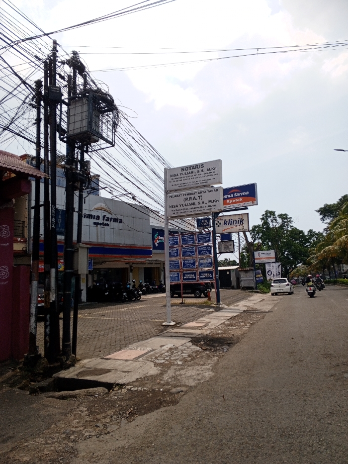 This image depicts a daytime street scene in an urban or semi-urban area, identified by signage as Cianjur Regency, West Java, Indonesia. In the foreground left, a tall utility pole is heavily encumbered with numerous tangled black electrical and communication wires, from which a large grey transformer box is mounted. A segment of a red-orange building is visible immediately to the left. Mid-ground left features a two-story building with a white and blue facade, identified as "Kimia Farma Apotek" (pharmacy). A paved area in front of this building serves as parking for several motorcycles or scooters. To the right of the Kimia Farma building, a prominent white signpost displays multiple signs. The primary signs identify "NOTARIS NISA YULIANI, S.H., M.Kn" and "PEJABAT PEMBUAT AKTA TANAH (P.P.A.T) NISA YULIANI, S.H., M.Kn," explicitly noting "SALAFARJAYA HADI SUBROTO CIANJUR" for the location. Additional smaller signs indicate "Kimia Farma Apotek" and "Klinik," along with a dense cluster of various blue-framed informational or advertising notices. A black pickup truck is partially visible behind the lower signs. The asphalt road, exhibiting signs of wear and minor cracks, extends from the foreground into the background, curving gently to the right. A deteriorated section of concrete pavement with an open drain borders the road, transitioning to a grey interlocking brick sidewalk leading to the Kimia Farma entrance. On the right side of the road in the mid-ground, a white sedan is parked, and multiple individuals on motorcycles are observed driving away from the viewer. The background on the right side of the road features lush green trees, including palm trees. The sky above is partly cloudy with bright areas, indicating daylight conditions. No direct interactions between individuals are discernible.