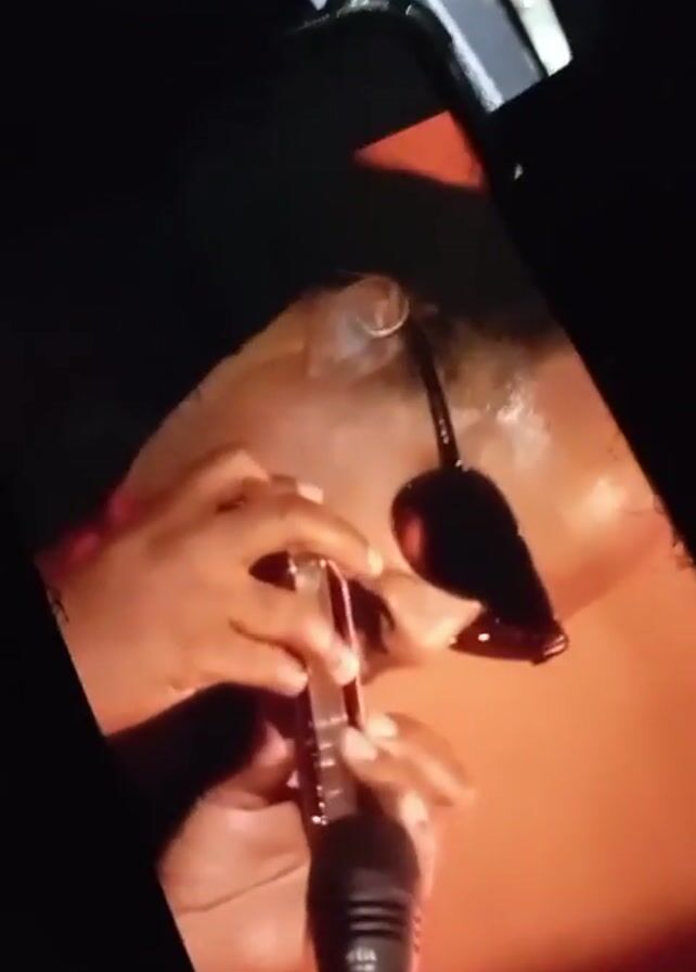 person with dark skin, wearing sunglasses, and playing a harmonica in front of a microphone. The scene appears to be a video recording being viewed on a screen, surrounded by dark edges, possibly inside a car. The background behind the harmonica player is a blurry reddish-orange hue. The player’s hands are visible, holding the harmonica close to their mouth.
