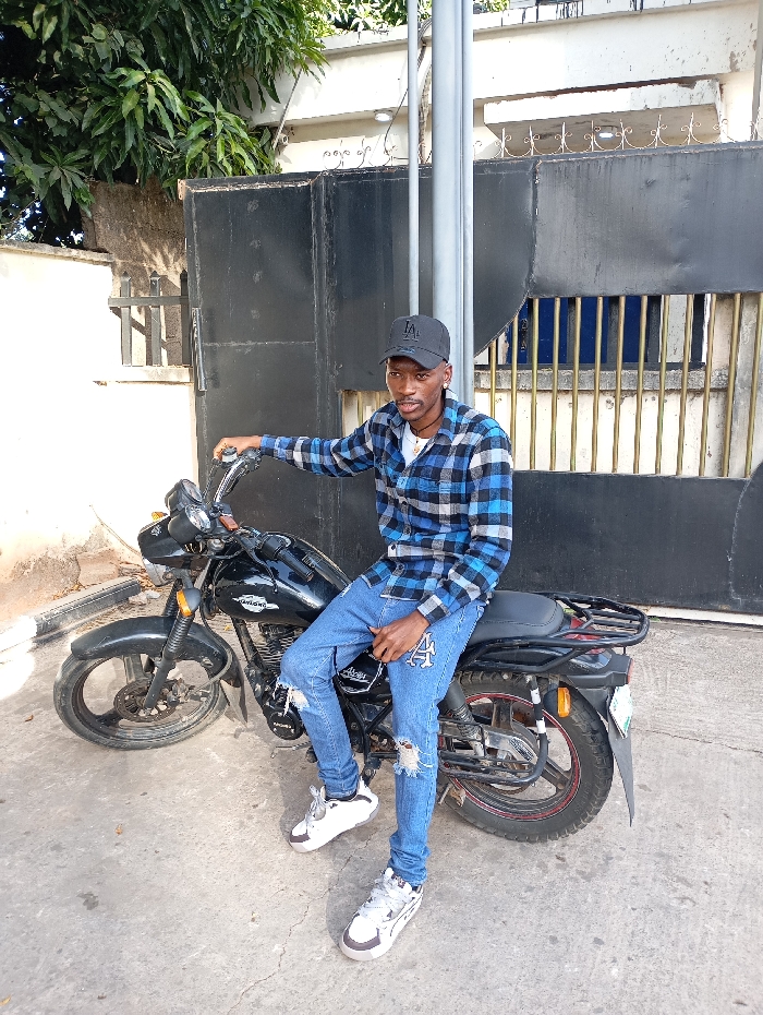 A young man sits astride a black motorcycle on a concrete surface. He wears a black baseball cap, a blue plaid shirt, ripped blue jeans with a white "A" on the thigh, and white sneakers. The motorcycle is parked in front of a tall black gate with metal bars. Lush green foliage is visible in the upper left, and a white building can be seen behind the gate. A tall metal pole stands next to the gate.