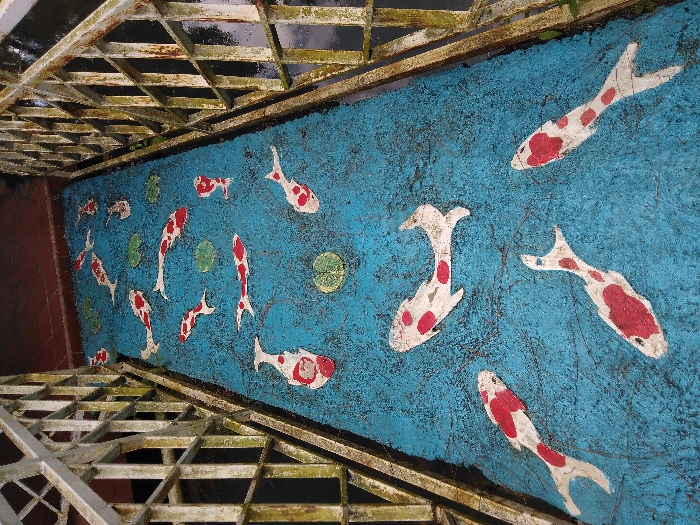 The image displays a pedestrian pathway or bridge deck, located in Elverum, Norway, viewed from an elevated perspective. The central surface of the pathway is painted a mottled, textured blue, intended to simulate water. Emblazoned on this blue surface are approximately fifteen to twenty stylized koi fish, depicted in white with irregular red-orange blotches, oriented in various directions to suggest movement. Several green lily pads are also painted intermittently among the fish. The pathway is bordered on both sides by identical metal railings. These railings are off-white or light gray, heavily weathered, exhibiting extensive rust, paint degradation, and patches of green biological growth consistent with moss or algae. They are constructed with a grid-like pattern of intersecting vertical and horizontal bars. At the upper termination of the blue pathway, a reddish-brown tiled or paved surface is visible. Beyond the railings, a dark, reflective surface, consistent with water, is present, reflecting overhead light. No individuals or active interactions are depicted within the scene.