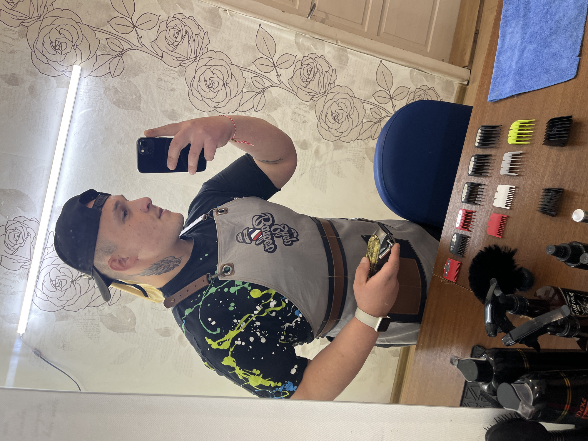A person is taking a selfie in a mirror. The person is wearing a black baseball cap, a black t-shirt with paint splatter design, and a gray barber apron. The person has a neck tattoo. The person is holding a phone in their left hand and a gold-colored hair trimmer in their right hand. The background shows a floral wallpaper, a blue chair, and a table with various barber supplies including hair clipper guards, brushes, and spray bottles. The location is indicated as Hirevo, Bulgaria.