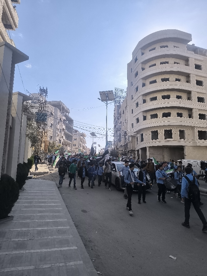 An outdoor urban scene depicts a procession of approximately 40-50 individuals, primarily young males, moving down a paved street under a clear blue sky. The location is an unidentified city, Unknown, Unknown. **Environment:** The street is lined with multi-story buildings. On the right, a prominent multi-story building with a rounded facade is under construction or renovation, exposing concrete and empty window openings. On the left, buildings with light-colored facades are visible, along with utility poles featuring complex wiring. A tall street light with solar panels is situated in the mid-ground. A tiled sidewalk with dark green hedges runs along the left side of the street. **People and Actions:** The individuals are marching, occupying the width of the road. Many are carrying flags, predominantly green, black, and white, some resembling Palestinian flags, others possibly Syrian opposition flags. Several participants, mostly on the right side of the procession, are wearing light blue shirts and are equipped with drums and other percussion instruments, indicating a marching band. A silver sedan is visible within the procession, and another white vehicle is partially obscured further down the street. Most individuals are facing generally away from the camera, progressing forward.