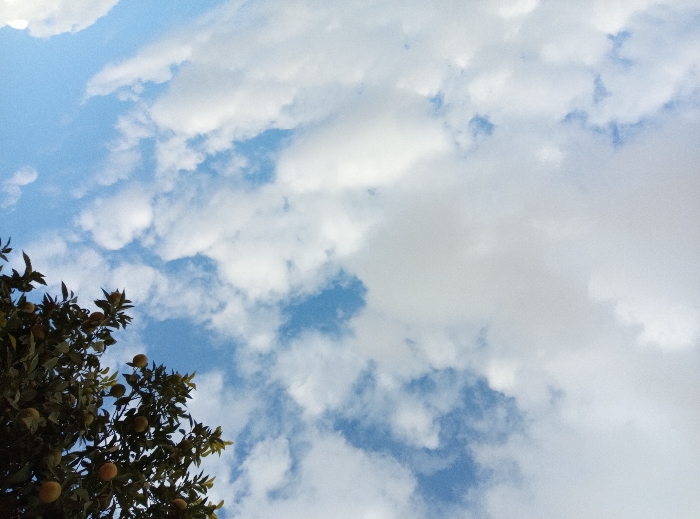 The scene depicts an outdoor view dominated by a partially cloudy blue sky. The upper right quadrant features a densely foliated tree branch, bearing multiple round, yellowish-orange fruits, consistent with citrus, likely oranges. The leaves are dark green. White cumulus clouds are scattered across the blue sky. No human subjects, man-made structures, or specific ground-level identifiers are visible. The location is Fez, Morocco.