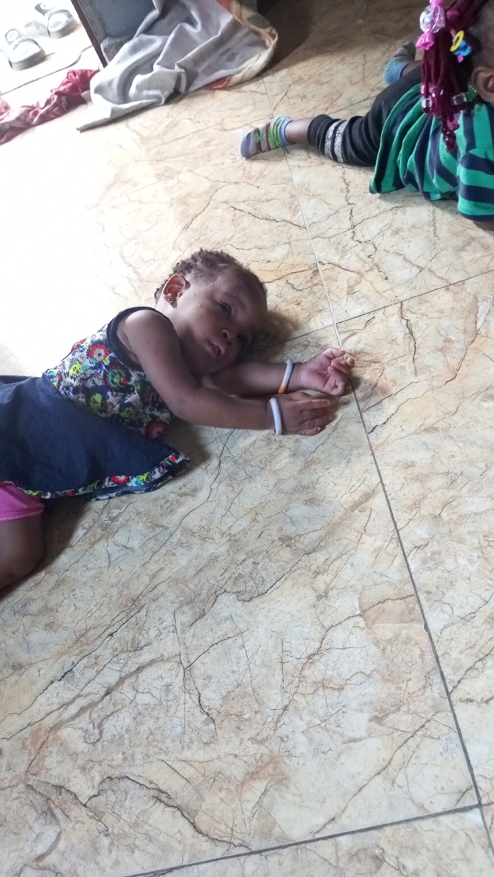 On a marble floor, two young children lie on their stomachs. One child, wearing a patterned top with a denim skirt and bracelets on their wrists, rests their head on their hands. The other child is seen partially, wearing a green and black striped top and colorful socks. A blanket and a pair of shoes are visible in the background.