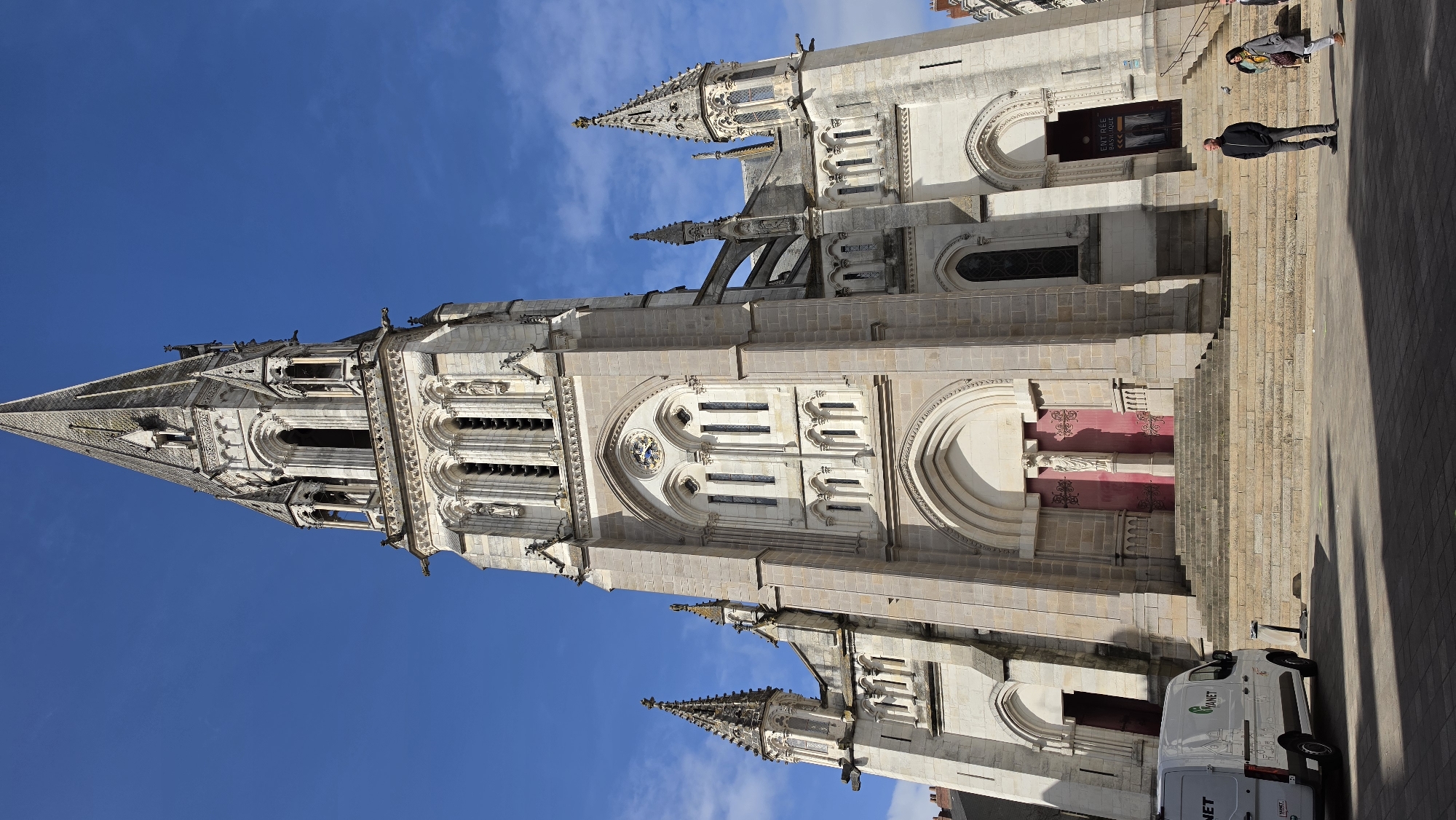 This image displays the Basilica of Saint-Nicolas, located in Nantes, France, under a clear blue sky with scattered white clouds. The prominent neo-Gothic basilica is constructed of light-colored stone, featuring a tall, ornate central spire, numerous arched windows, decorative sculptures, and a clock face on its main facade. Wide stone steps lead up to the main and side entrances, which are fitted with distinct red doors. On the paved square in the lower left, a white commercial van, branded with "VANET" in green and black, is parked. In the lower right foreground, a man stands facing forward, dressed in a dark jacket and grey trousers. Behind and to his right, a woman in a light coat and yellow scarf is partially visible, appearing to walk. A bird is present on the pavement near the woman. Shadows from the church extend across a portion of the square, indicating direct sunlight. Peripheral urban structures are visible on both the left and right edges of the frame.