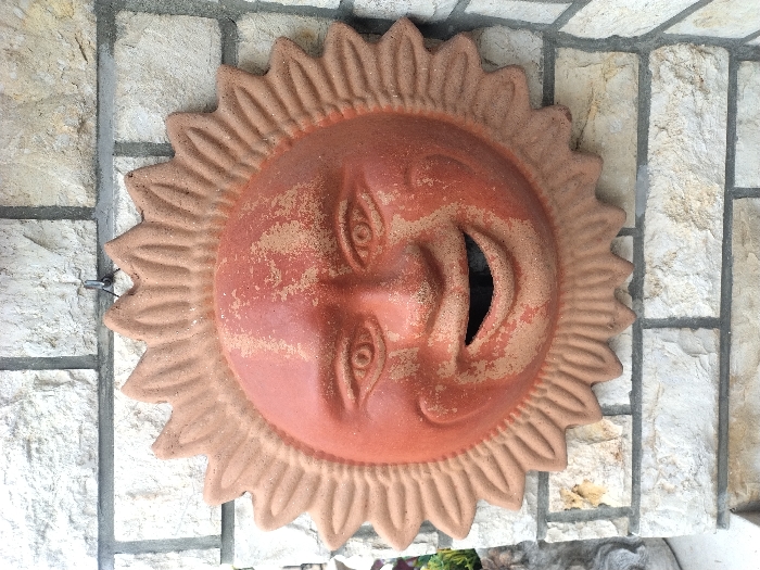 A weathered, circular terracotta sun face decoration is centrally mounted on an exterior wall composed of light-colored, irregularly shaped stone blocks with dark grey mortar lines