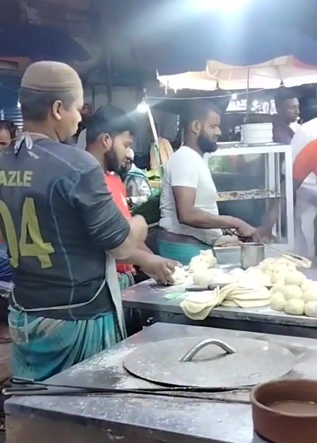 three men working at a food stall. The man on the left is wearing a gray long-sleeved shirt with the name “FAZLE” and the number “04” on the back. He is also wearing a prayer cap and a light blue lungi. He is working with dough on a stainless steel counter. The man in the middle is wearing a red t-shirt and is also working with dough. The man on the right is wearing a white t-shirt and is using a spatula to cook something in a pan. There are many balls of dough on the counter. Behind the men, there are other people and some food stalls.