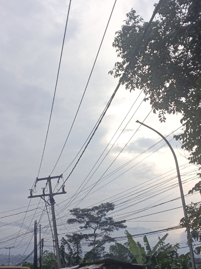 The image depicts an outdoor urban environment in Kon Tum city, Vietnam. A dense network of black power and communication lines crisscrosses the upper two-thirds of the frame, set against an overcast, light grey sky with a bright, diffuse light source in the upper right. In the mid-ground on the left, a dark wooden utility pole, slightly angled to the left, supports a horizontal cross-arm with three visible insulators and multiple attached wires. Several thinner, darker utility poles are partially visible behind and to the right of this primary pole. On the right side, a slender, dark streetlamp pole with a pronounced upward-curving arm stands prominently, silhouetted. Dense green foliage from a large tree occupies the upper right quadrant. Another tree with dark foliage is centrally located in the mid-ground, with broad-leafed tropical plants, possibly banana trees, visible in the lower mid-ground. Distant mountains or hills, indistinct due to atmospheric haze, form the background horizon. A fragment of a corrugated metal roof or similar structure is present at the bottom edge, center-right. No human subjects or active events are depicted.