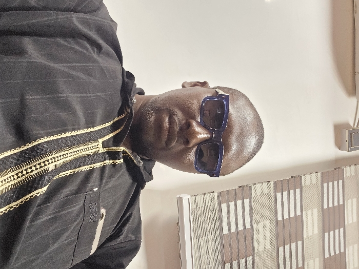 The image displays an adult male, captured from a head-and-torso perspective. He has dark skin, a bald or closely shaved head, and light facial stubble on his chin and upper lip. He wears rectangular blue-framed sunglasses with dark, reflective lenses. His attire consists of a black, long-sleeved tunic or caftan, featuring intricate gold and black geometric embroidery vertically down the central front. The garment also exhibits subtle vertical pinstripes. A light-colored object, possibly a smartphone or notepad, is partially visible protruding from the left breast pocket. The subject faces the camera directly, indicative of a selfie or close-up portrait. The background is a plain, light-colored wall. In the upper right quadrant, a section of a patterned window blind with alternating horizontal light and dark brown/beige stripes is visible. A small, rectangular object, appearing to be a fixture or sensor, is mounted on the wall above the blind. The specific location within Jos, Nigeria, is not identifiable from the visual evidence presented.