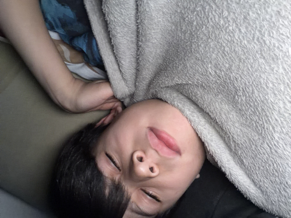 - "A person with dark hair is lying down, with their eyes closed and face partially covered by a fluffy, light grey blanket" by FM-rFq5f2, licensed under CC BY 4.0