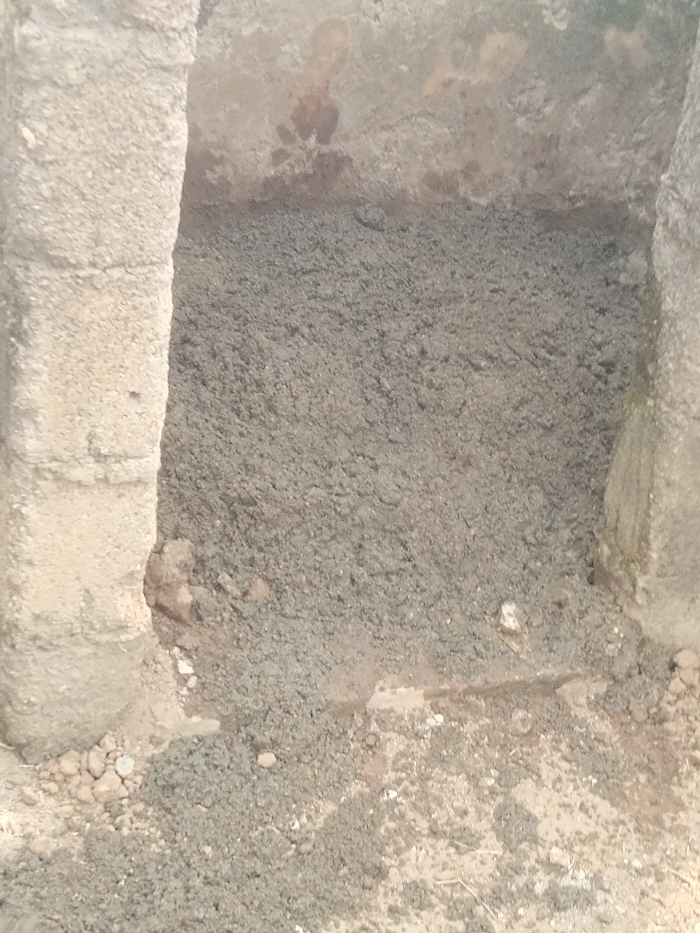 The scene, located in Kachia, Nigeria, depicts a confined ground-level excavation or structural opening. Two vertical, rough-textured elements, appearing to be unfinished concrete or cinder block walls, define the left and right perimeters of the visible space. The central floor area is covered by a uniform layer of granular, grey-toned material, consistent with compacted sand and small aggregate. The rear surface is a lighter, discolored wall exhibiting several dark, irregular stains towards its upper portion. No individuals, specialized equipment, or active processes are visible within the frame.